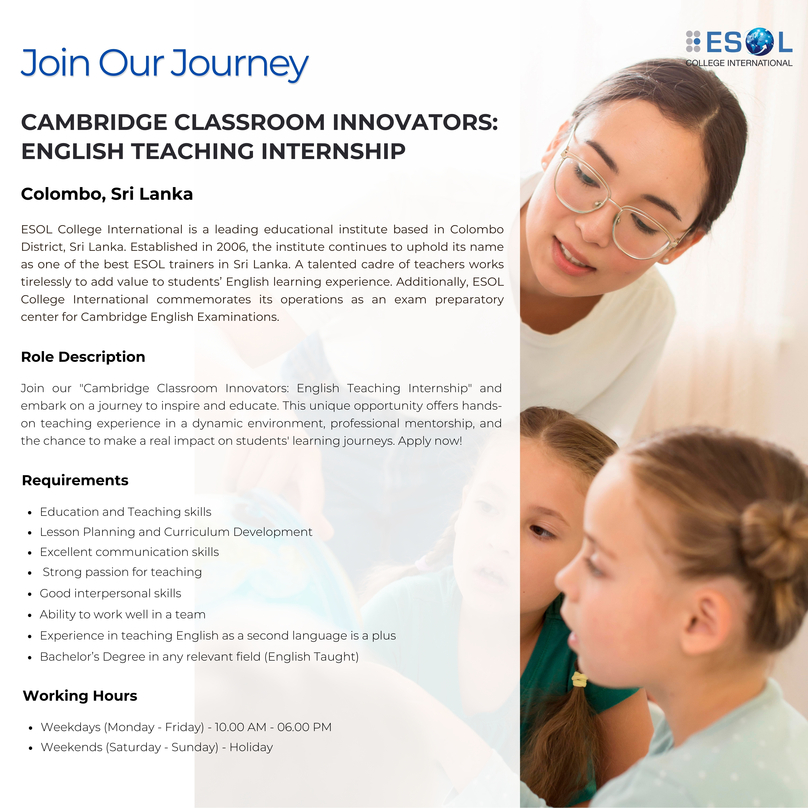 Join our "Cambridge Classroom Innovators: English Teaching Internship" and embark on a journey to inspire and educate. This unique opportunity offers hands-on teaching experience in a dynamic environment, professional mentorship, and the chance to make a real impact on students' learning journeys.